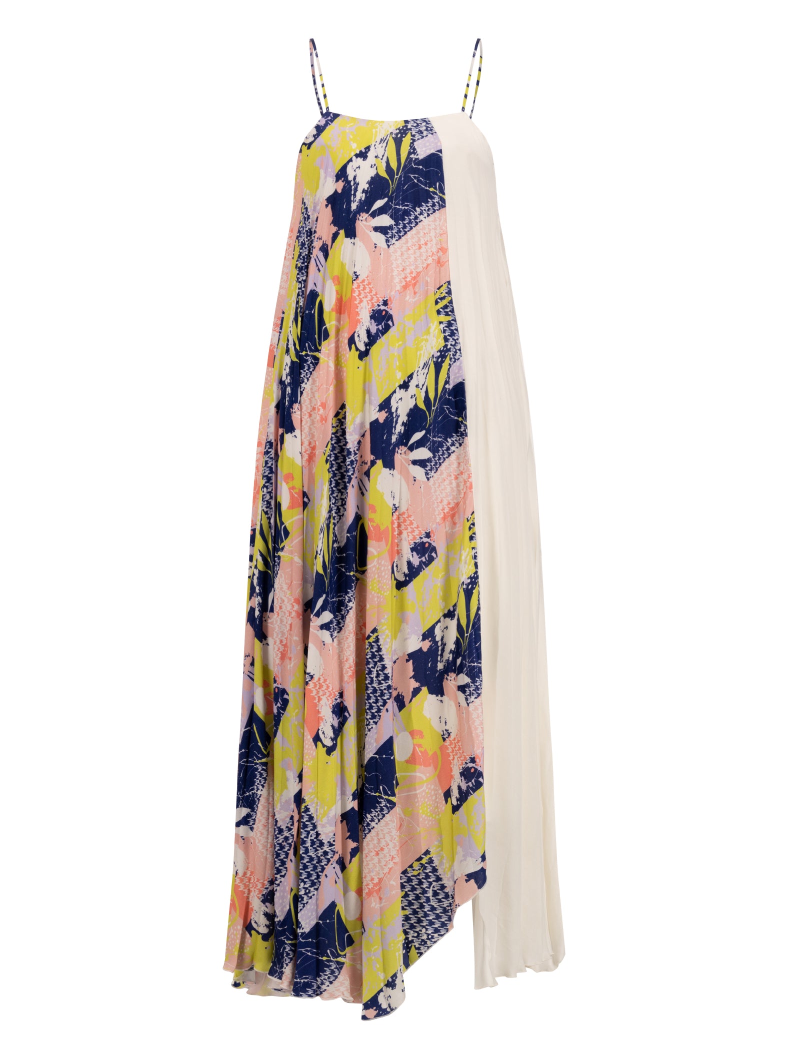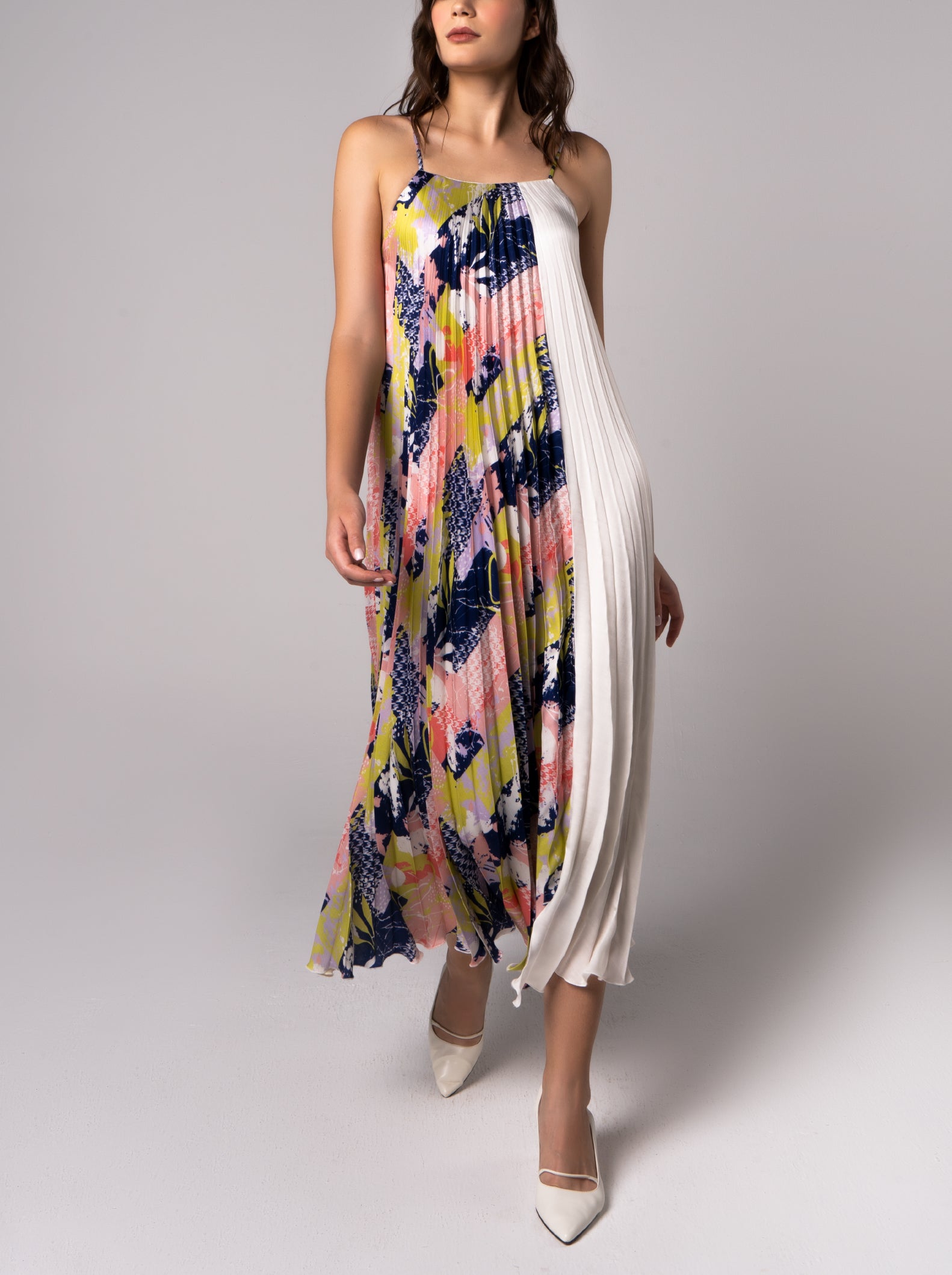 The Pleated Canvas Maxi Dress is a stunning blend of artistry and elegance. Featuring a vibrant abstract print that cascades into intricate pleats, this dress is a celebration of color and texture. The delicate spaghetti straps and relaxed silhouette provide effortless comfort, while the contrasting white pleated panel adds a modern twist. Perfect for daytime gatherings or evening soirées, this dress is for the woman who values bold style with a touch of sophistication.